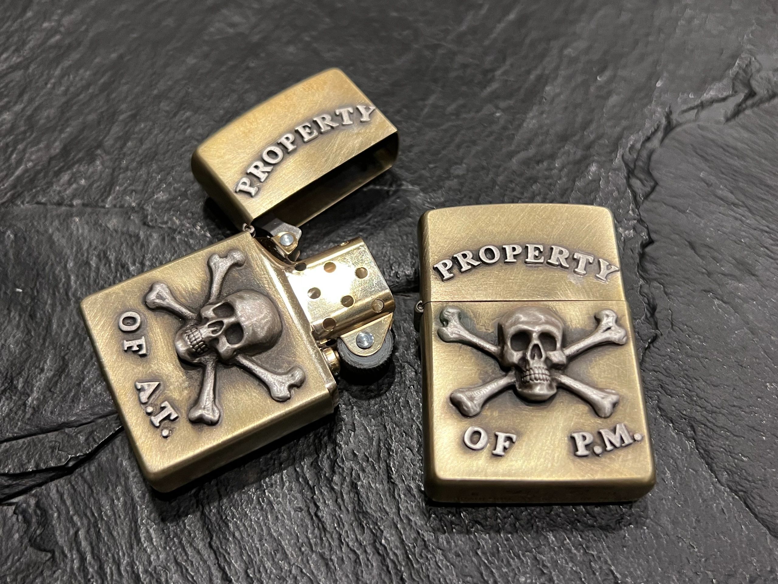 *1 BRAND NEW SOLID BRASS ZIPPPO *STERLING SILVER SKULL N CROSSBONES WITH PROPERTY OF: (YOUR INITIALS) *THESE ARE ALL MADE TO ODRER AND TAKE 3-4 WEEKS TO MAKE