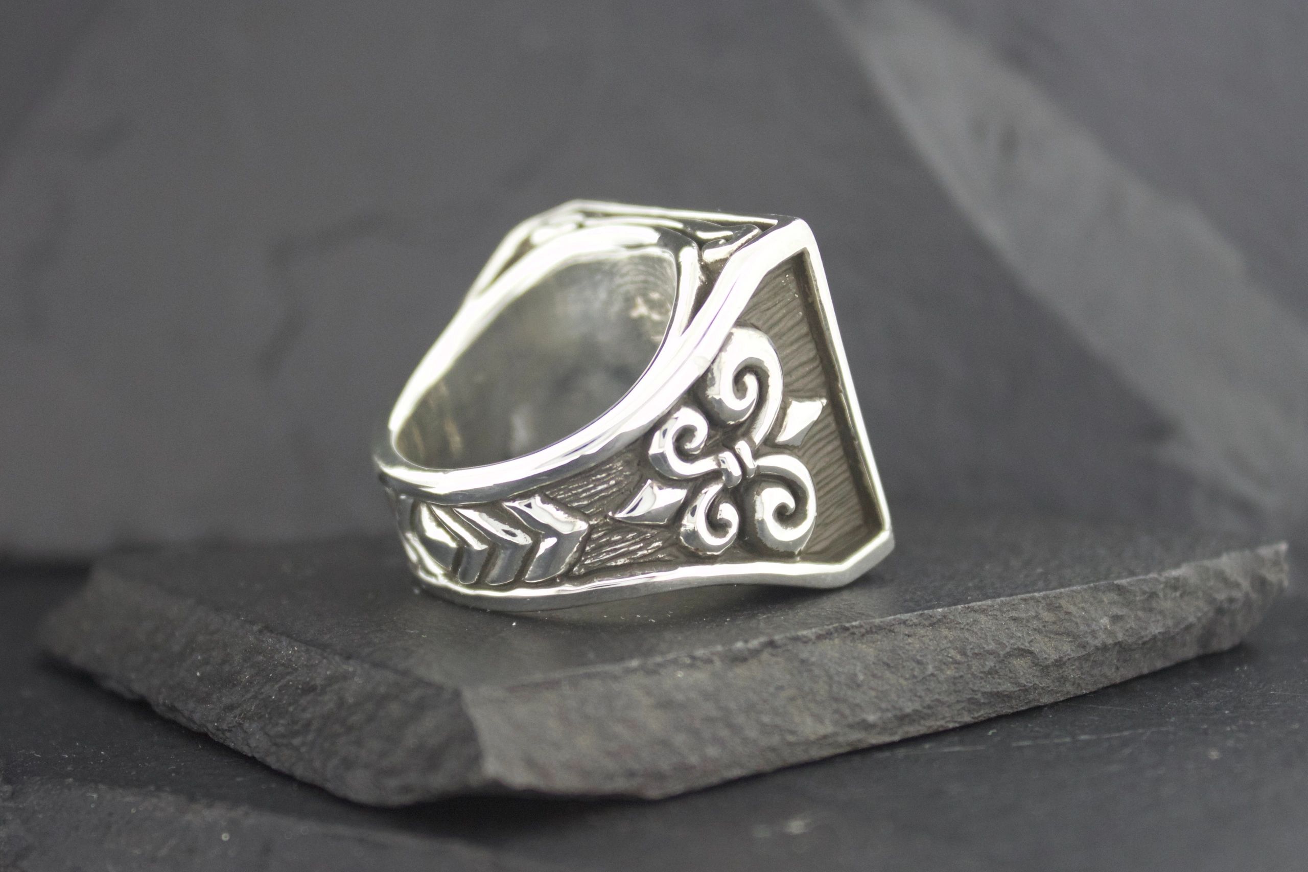 *Stone measures approximately  18X18mm. The exterior measures 25X25mm. *All rings are handmade in the USA in Nickel FREE Sterling Silver. *All rings are made to order and generally take about 2 to 3 weeks. *All rings are also available in 10K, 14K, or 18K yellow, white or rose gold, platinum and palladium . Prices available upon request. *Alternate stones and engraving can be added to most rings.   Prices available upon request. Â