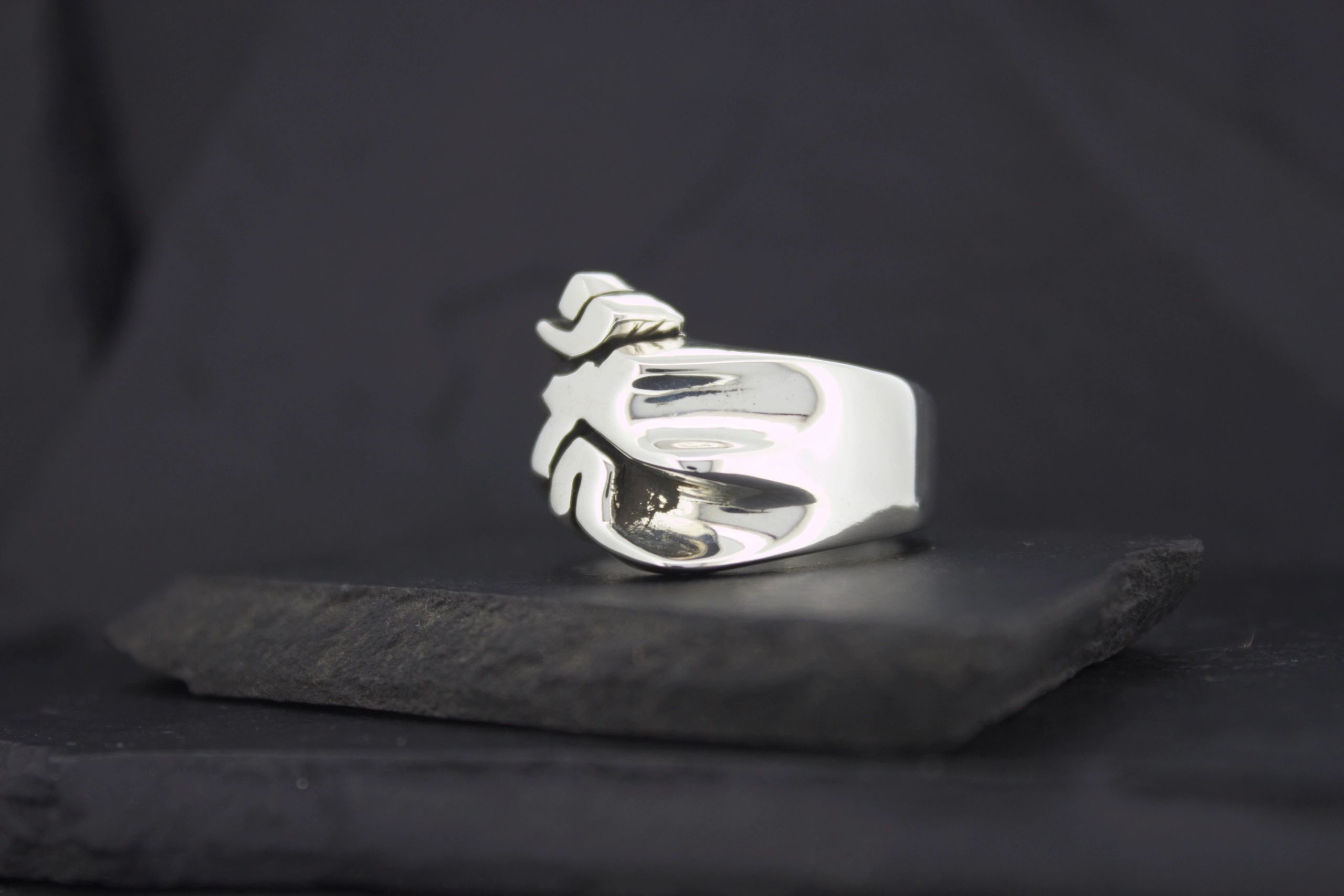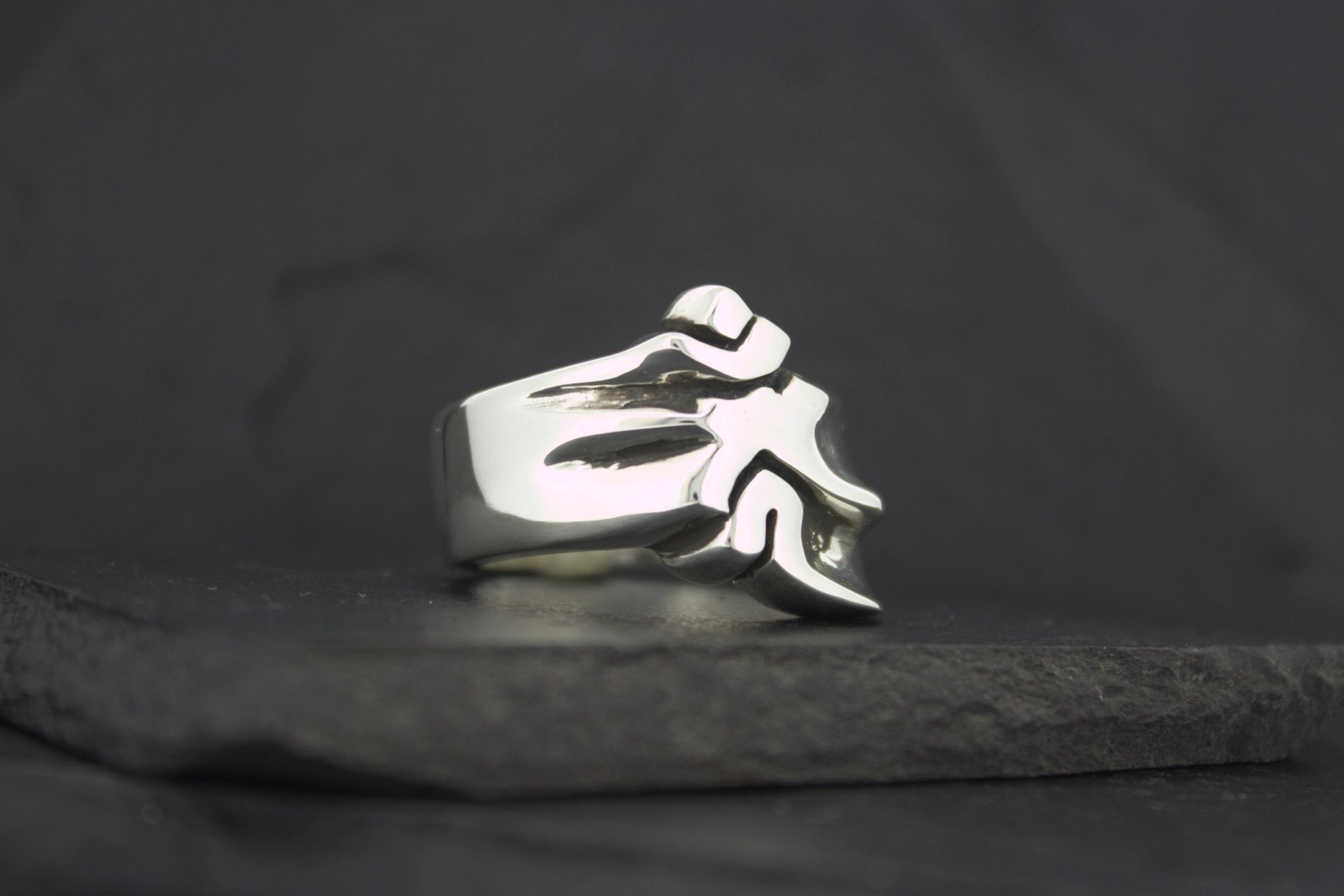 Description Of Form Acala Vidyârâja is one of the Vidyârâjas (Myôôs) class of deities, and a very wrathful deity. He is portrayed holding a sword in his right hand and a coiled rope in his left hand. With this sword of wisdom, Acala cuts through deluded and ignorant minds and with the rope he binds those who are ruled by their violent passions and emotions. He leads them onto the correct path of self control. Acala is also portrayed surrounded by flames, flames which consume the evil and the defilements of this world. He sits on a flat rock which symbolizes the unshakeable peace and bliss which he bestows to the minds and the bodies of his devotees. Purpose and Vows  Acala transmits the teachings and the injunctions of Mahâvairocana to all living beings and whether they agree to accept or to reject these injunctions is up to them, Acala’s blue/black body and fierce face symbolize the force of his will to draw all beings to follow the teachings of the Buddha. Nevertheless, Acala’s nature is essentially one of compassion and he has vowed to be of service to all beings for eternity. Acala also represents his aspect of service by having his hair knotted in the style of a servant: his hair is tied into seven knots and falls down from his head on the left side. Acala has two teeth protruding from out of his mouth, an upper tooth and a lower tooth. The upper tooth is pointed downward and this represents his bestowing unlimited compassion who are suffering in body and spirit. His lower tooth is pointed upward and this represents the strength of his desire to progress upward in his service for the Truth. In his upward search for Bodhi and in his downward concern for suffering beings, he represents the beginning of the religious quest, the awakening of the Bodhicitta and the beginning of his compassionate concern for others. It is for this reason that the figure of Acala is placed first among the thirteen deities. His vow is to do battle with evil with a powerful mind of compassion and to work for the protection of true happiness. To pray for recovery from illness and for safety while traveling is to rely upon his vow and power to save. Acala is also the guide for the deceased, to help save them and assist them in becoming buddhas for the first seven days after death. Mantra Nômaku sanmanda bazaradan senda makaroshada sowataya un tarata kanman. (Jpn.) Namah samanta-vajrânâm canda mahârosana sphotaya hûm trat hâm mâm (Skt.) Homage to the all-pervading Vajras! O Violent One of great wrath! Destroy! hûm trat hâm mâm  *All rings are handmade in the USA in Nickel FREE Sterling Silver.  *All rings are made to order and generally take about 2 to 3 weeks. *All rings are also available in 10K, 14K, or 18K yellow, white or rose gold, platinum and palladium . Prices available upon request. *Stones and engraving can be added to most rings.   Prices available upon request. Â