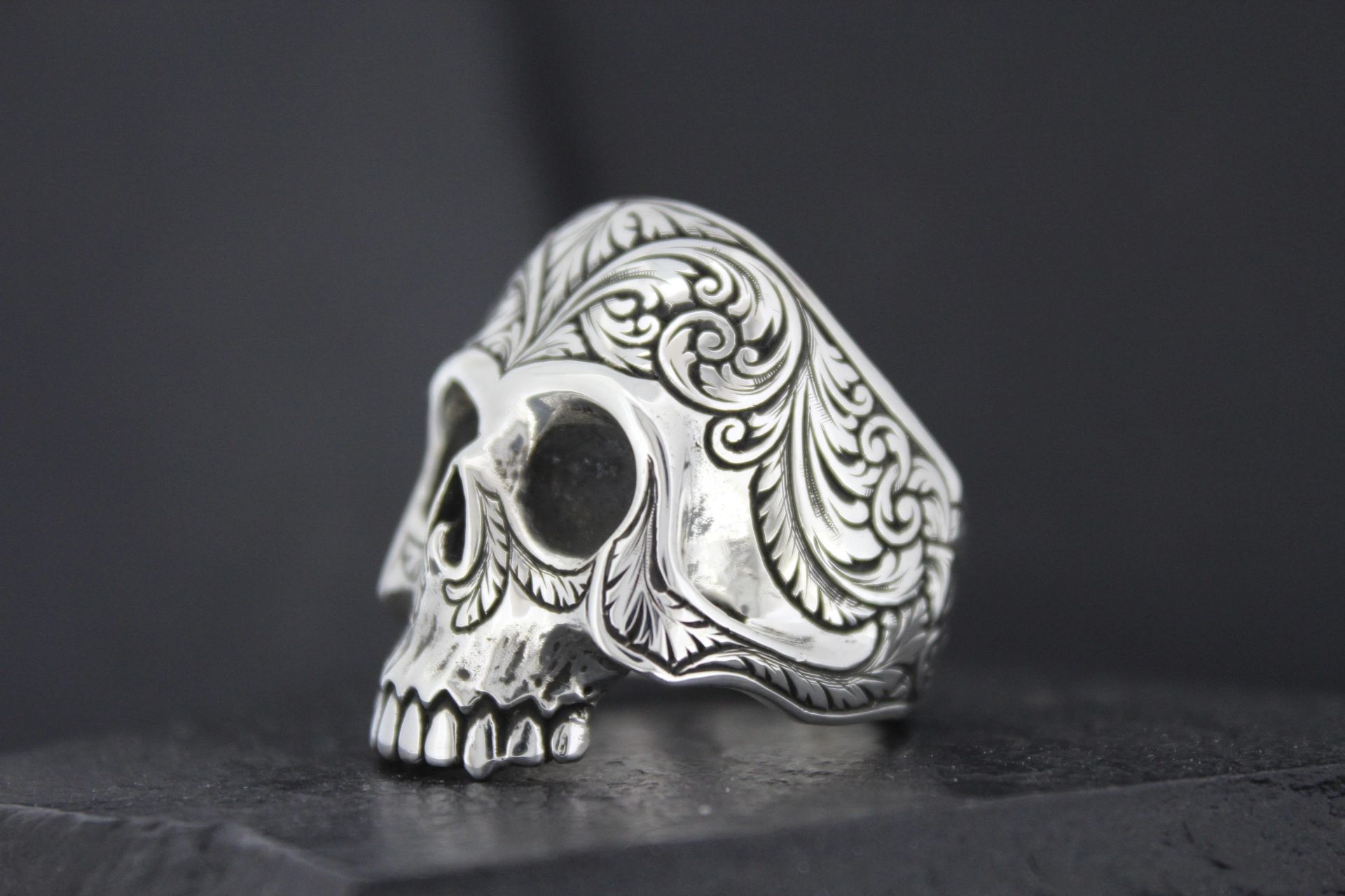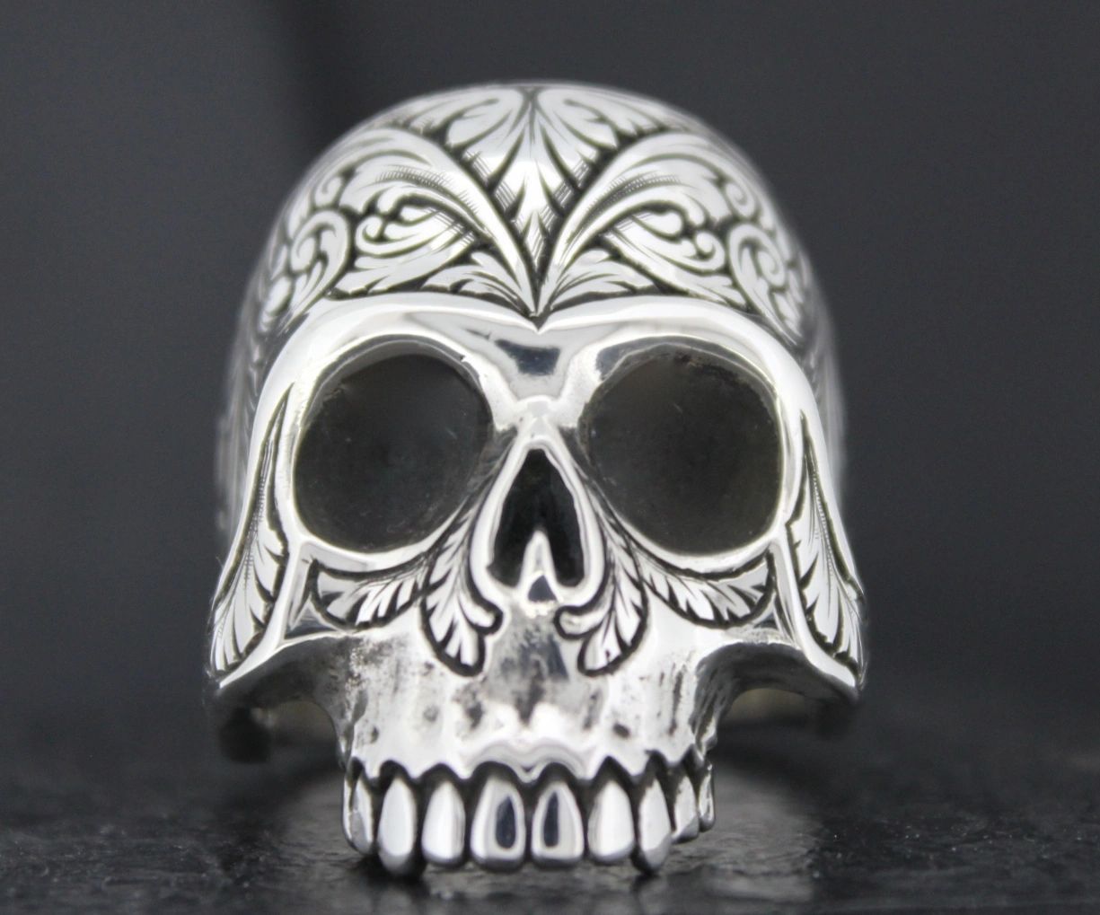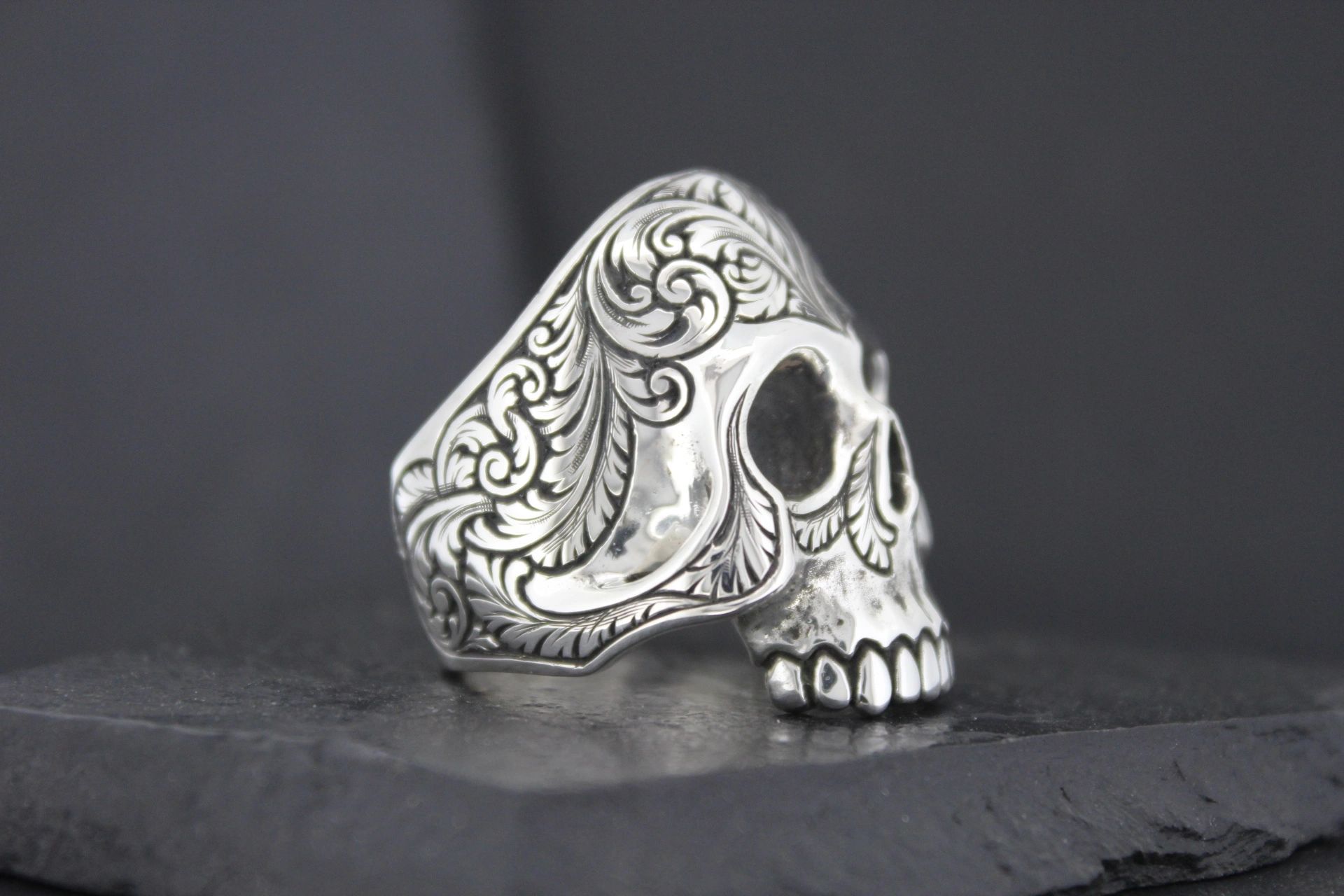 HAND ENGRAVED GUNSCROLL SKULL RING XXL
