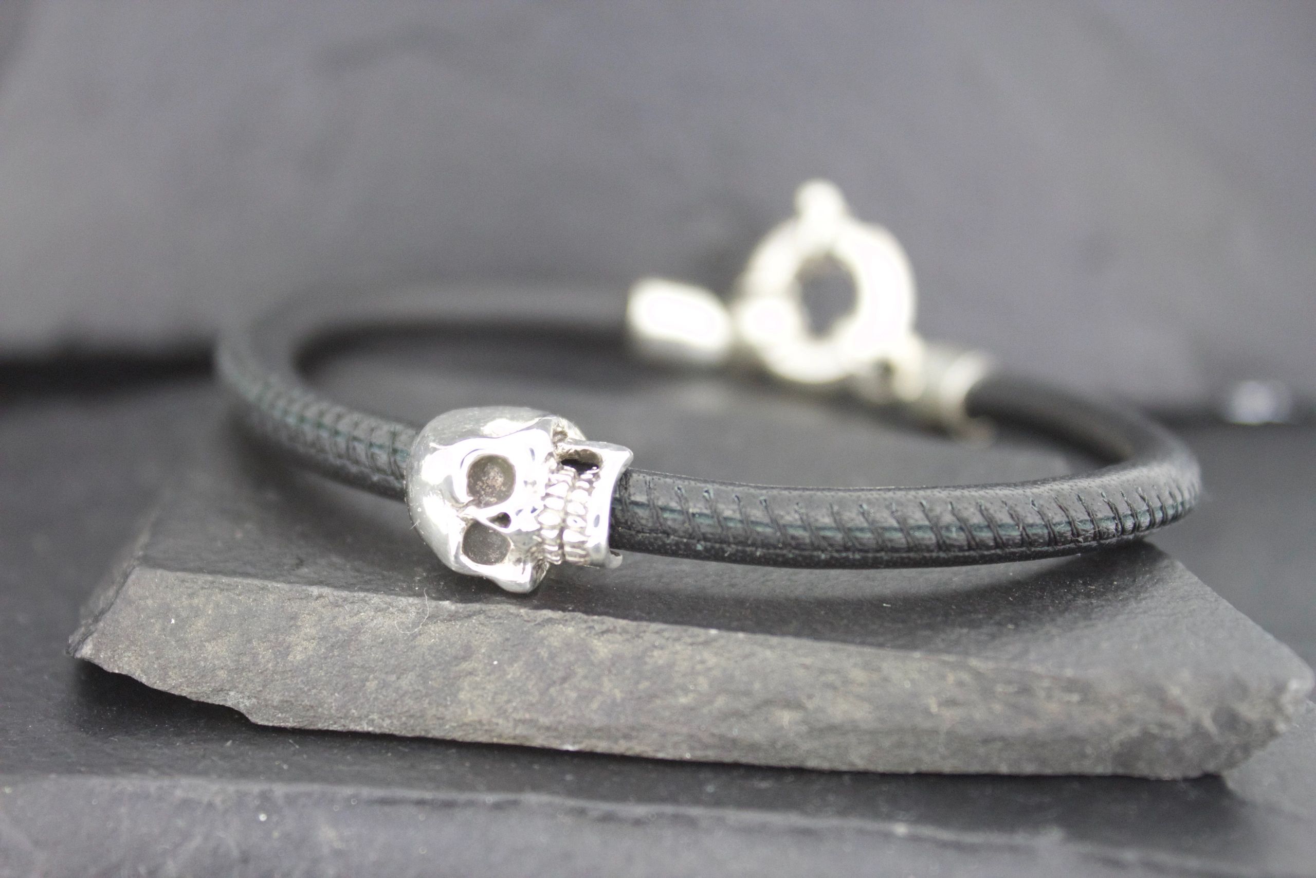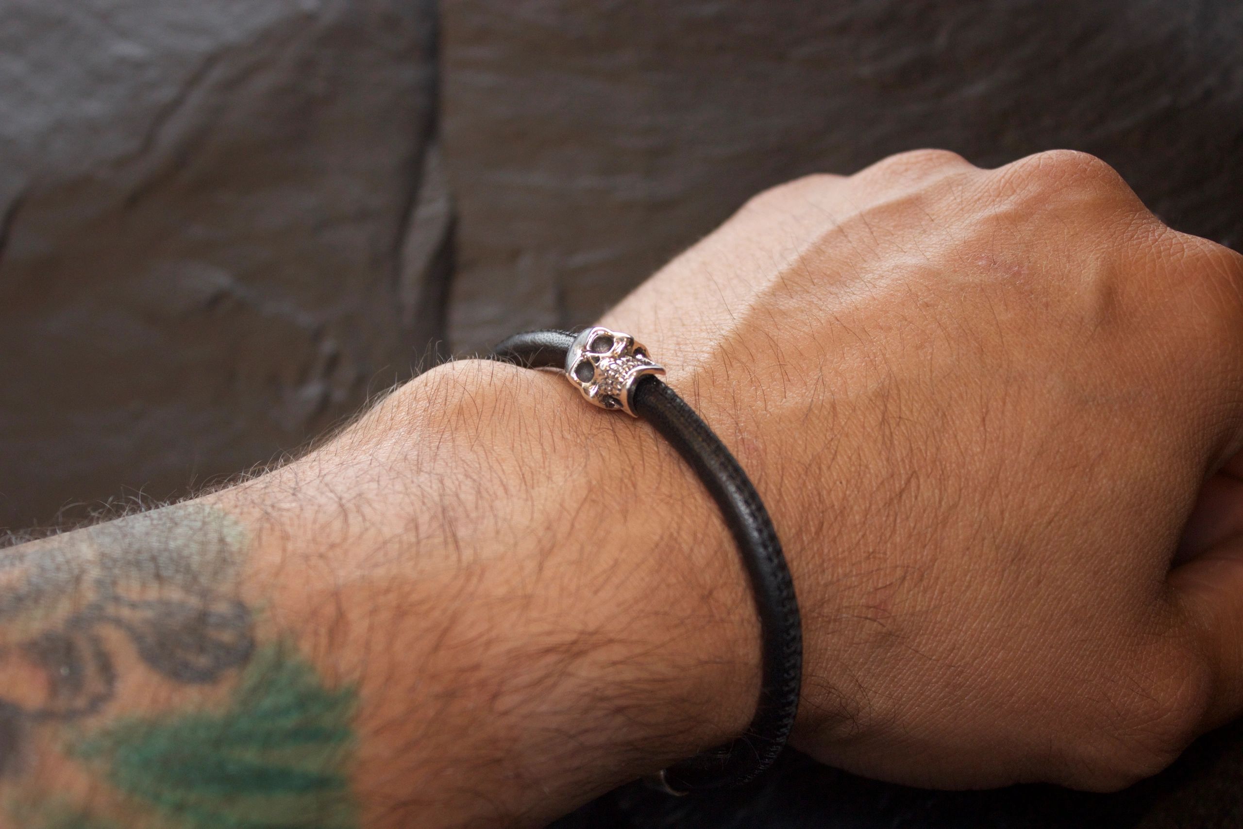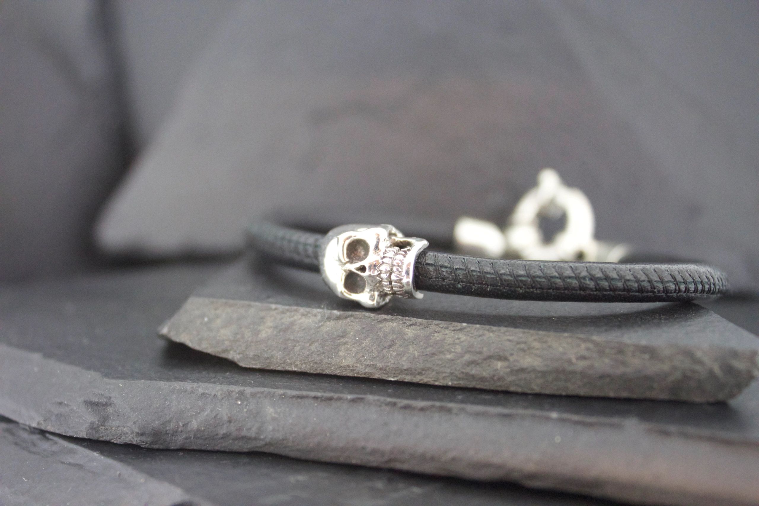 *Comes standard with one skull, additional skulls are optional. *All bracelets are handmade in the USA in Nickel FREE Sterling Silver and Italian leather cord. *All bracelets are made to order and generally take about 2 to 3 weeks. *All bracelets are also available in 10K, 14K, or 18K yellow, white or rose gold, platinum and palladium . Prices available upon request. *Stones and engraving can be added to most rings. Prices available upon request. ***VERY IMPORTANT When selecting the length of this bracelet add the appropriate amount to your measurement for your comfort.