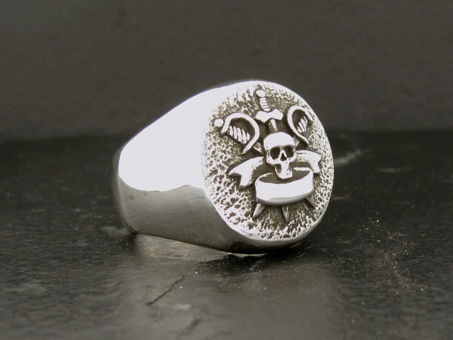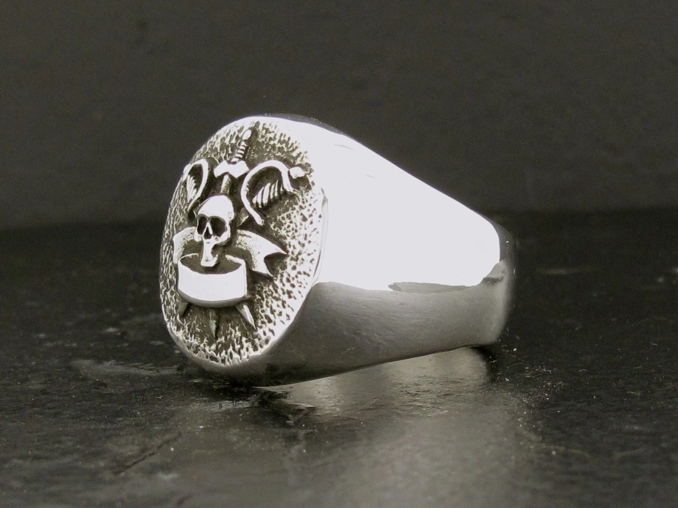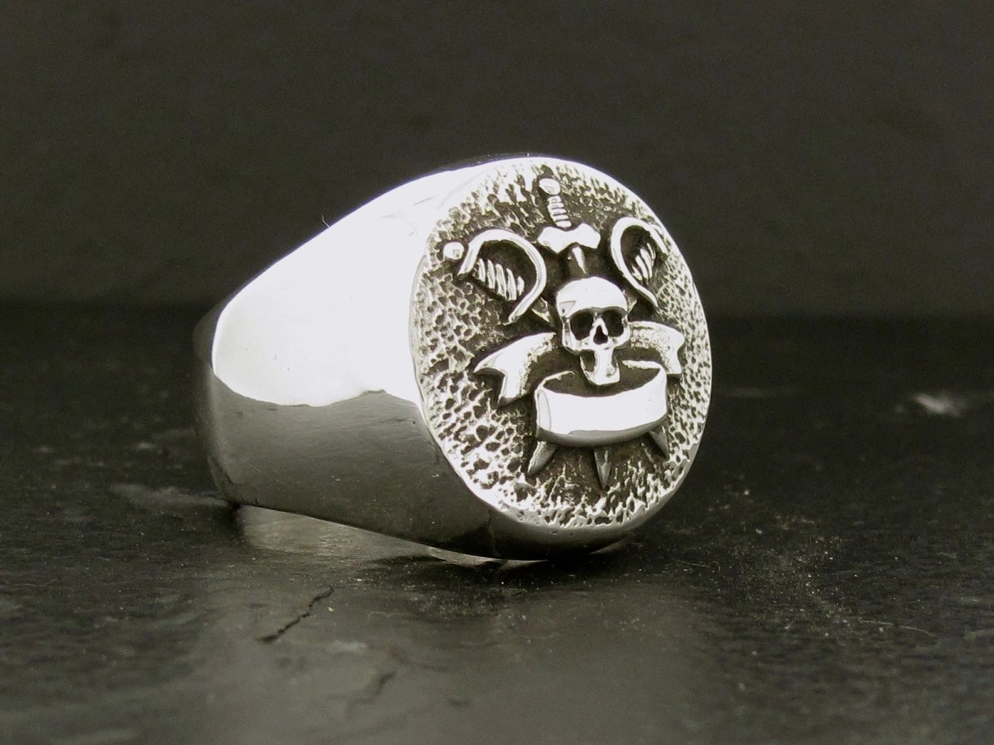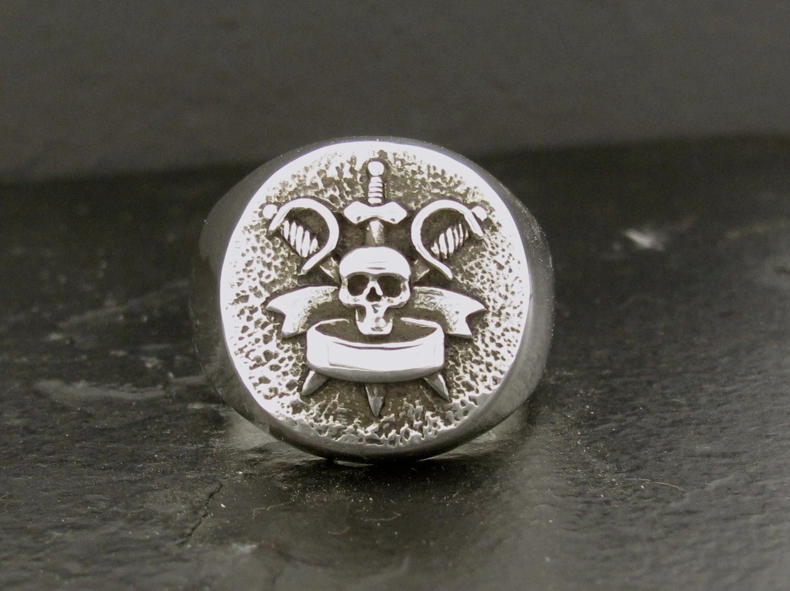 ROUND CREST RING SKULL W/ BANNER AND SWORDS