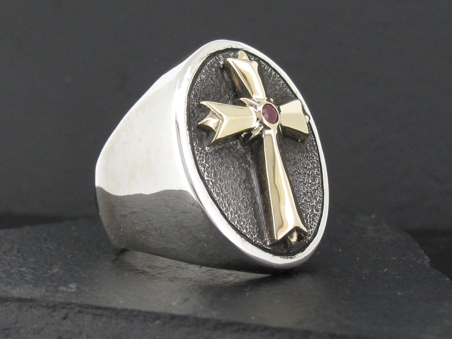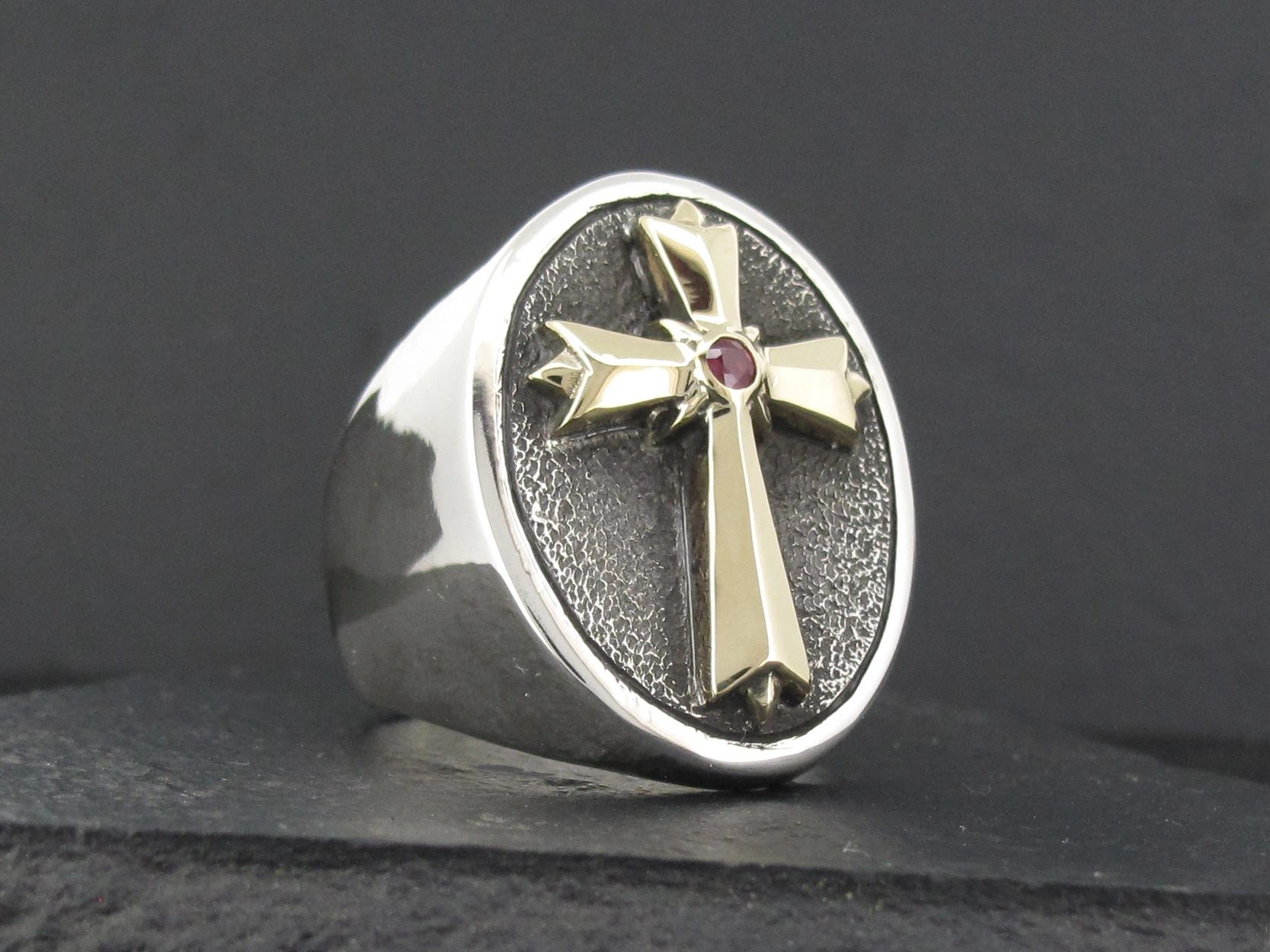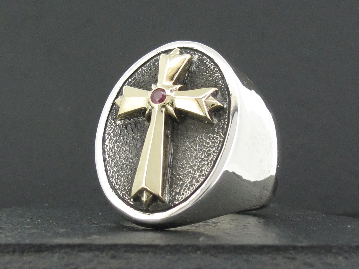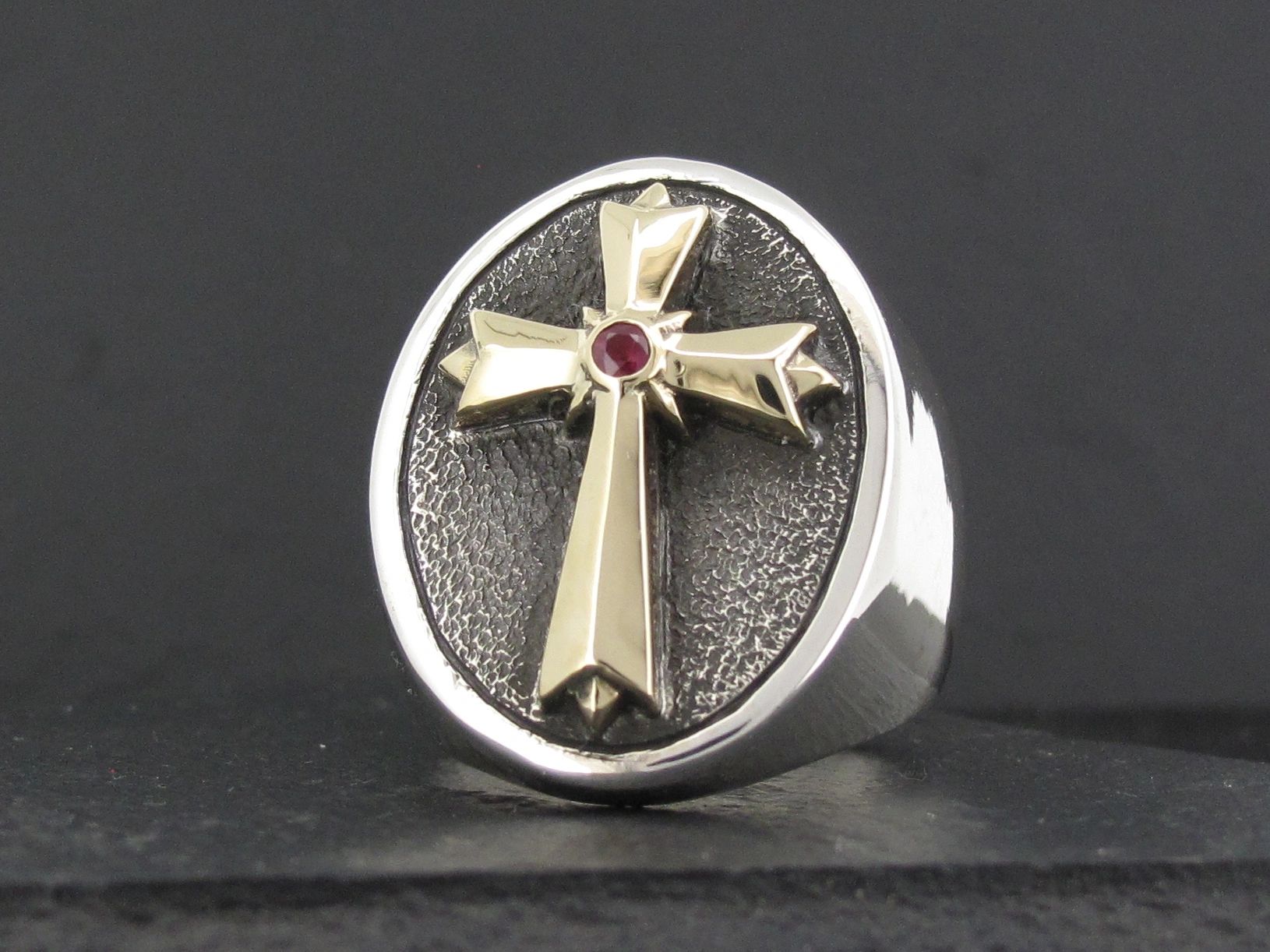 * The exterior oval measures 26 x 20 mm *Silver ring with 14K yellow gold cross with genuine ruby. *All rings are handmade in the USA in Nickel FREE Sterling Silver.   *All rings are made to order and generally take about 2 to 3 weeks.  *All rings are also available in 10K, 14K, or 18K yellow, white or rose gold, platinum and  palladium . Prices available upon request. *Stones and engraving can be added to most rings.    Prices available upon request.