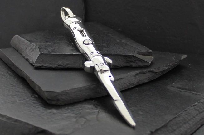 *Handmade in the USA in Nickel FREE Sterling Silver. *All pendants are made to order and generally take about 2 to 3 weeks. *All items are also available in 10K, 14K, or 18K yellow, white or rose gold, platinum and palladium . Prices available upon request. *Stones and engraving can be added to most rings. Prices available upon request. *Chain sold separately. *Approximately 5 inches in length. *Does NOT fold or have a sharp edge, but does come to a point *Not intended to be used as a weapon.